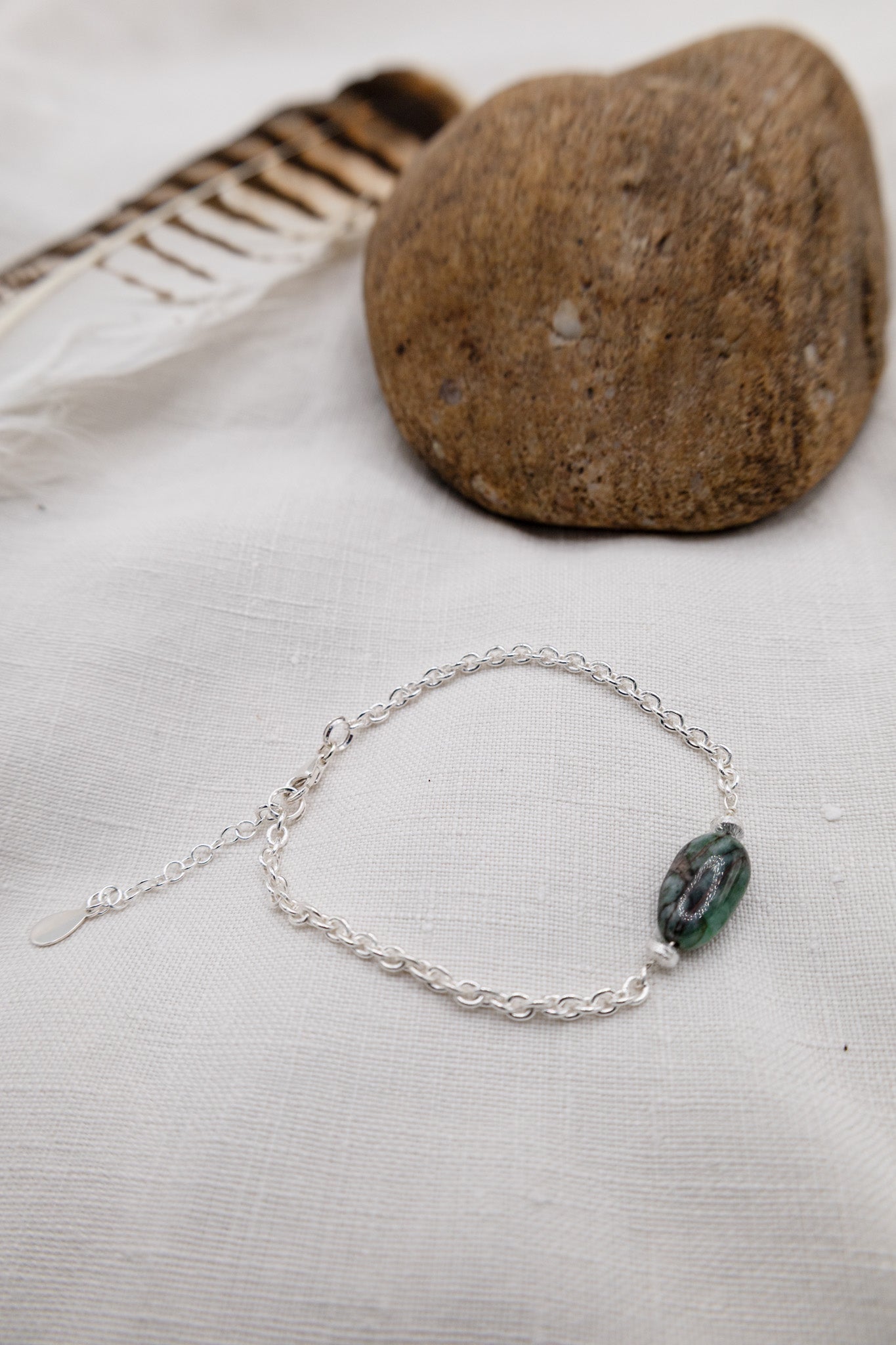 "Grünkraft" erinnert an sattes Laub, tiefe Wälder und die lebendige Energie der Natur im Sommer. Der Smaragd in seiner intensiven, grünen Farbe steht im Mittelpunkt dieses schlichten Armbands und bringt eine natürliche, kraftvolle Ausstrahlung mit sich.