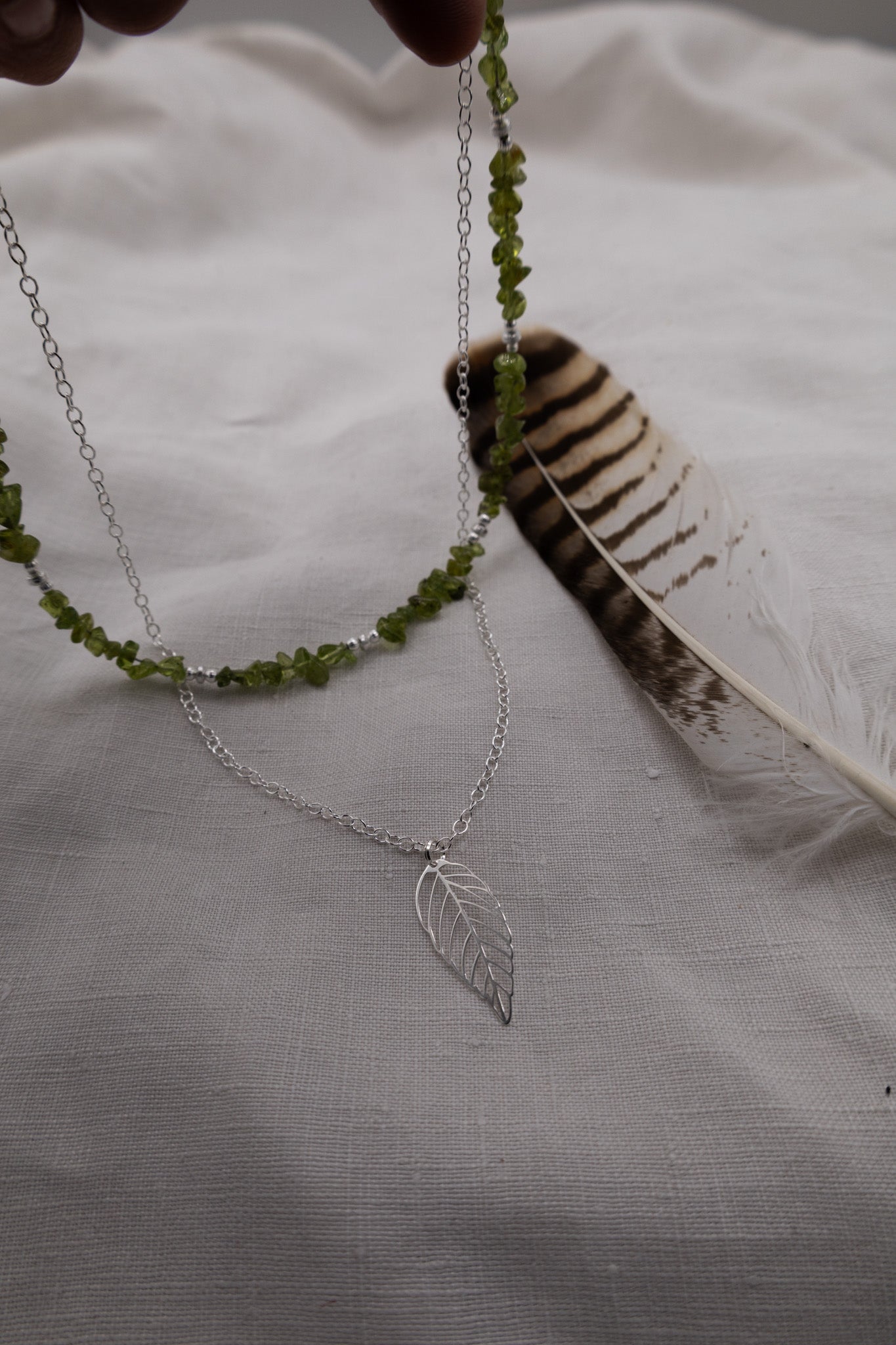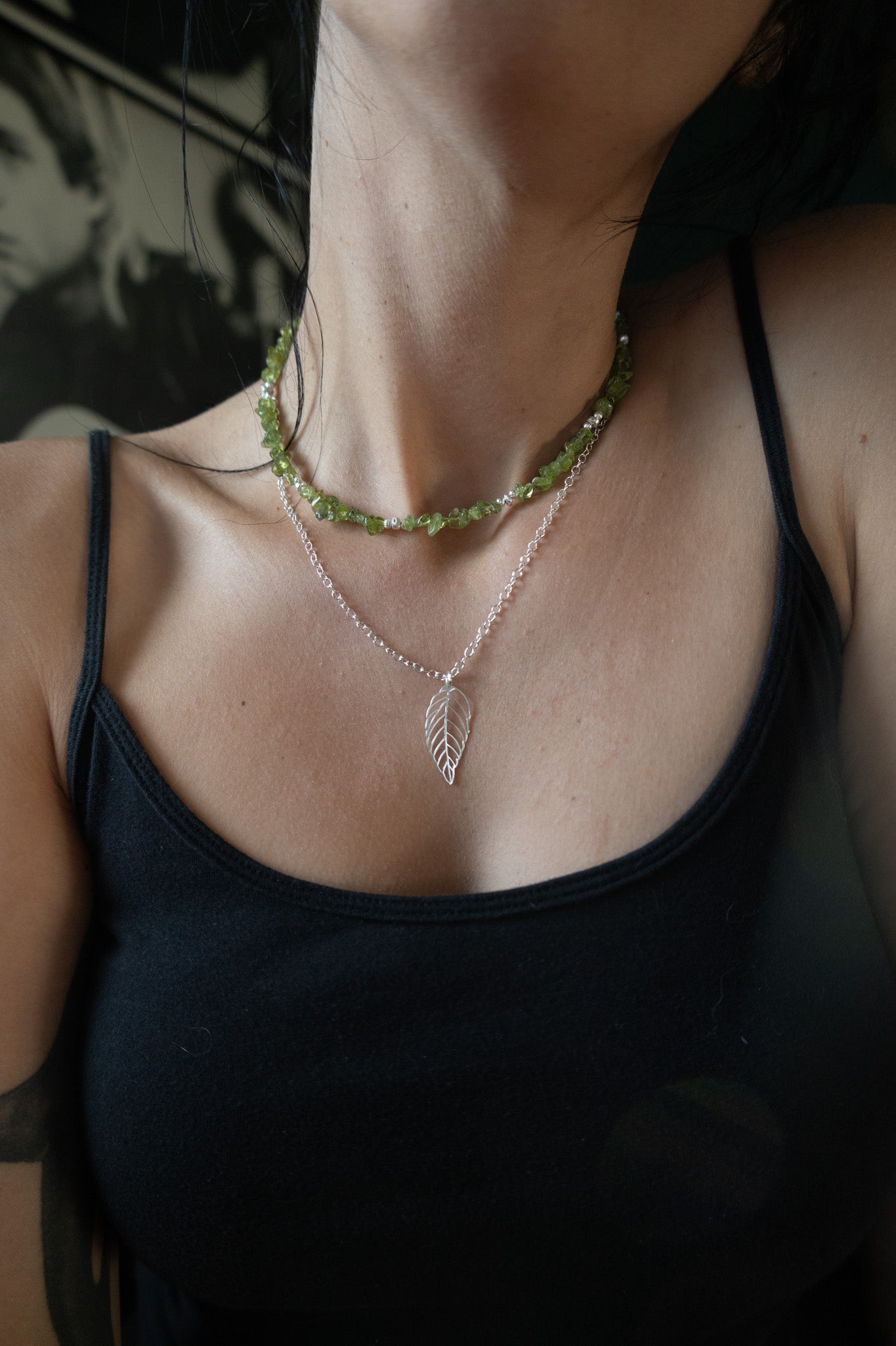 Ein Choker mit feinen Peridot-Steinen, dazu die längere Kette mit einem filigranen Blatt.