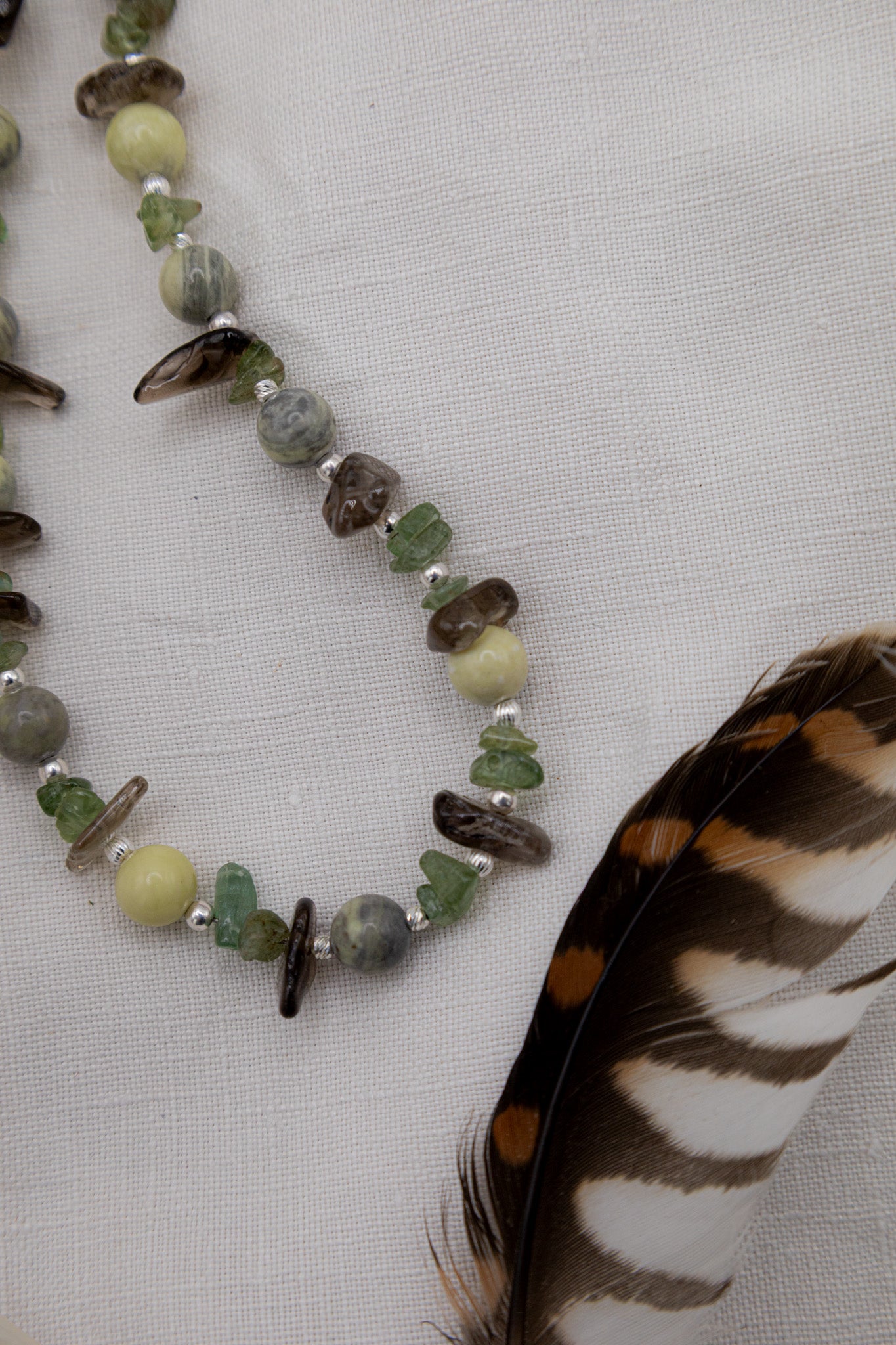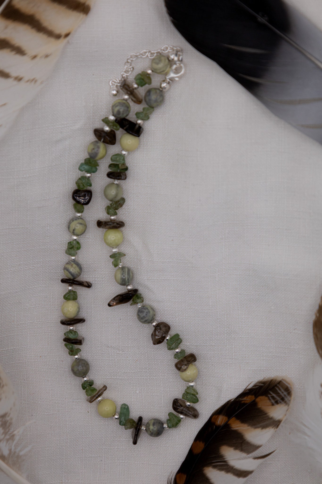 Diese filigrane Halskette verbindet die Kräfte von Rauchquarz, Aragonit und grünem Apatit zu einem harmonischen Schmuckstück, das dich sanft in deiner Verbindung zur Natur unterstützt.