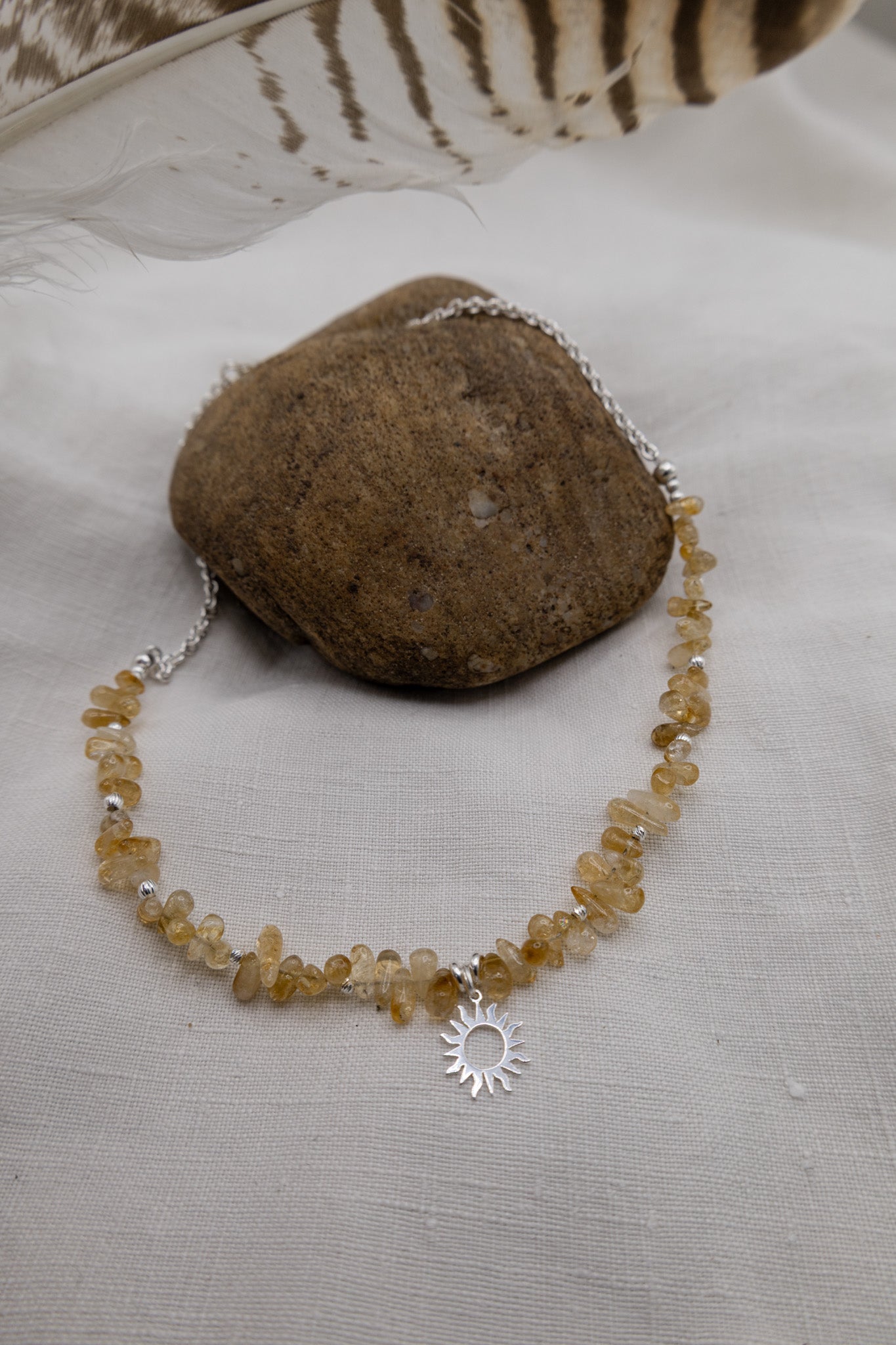 Der Citrin steht für Lebensfreude, Klarheit und Zuversicht. Er kann dabei unterstützen, die eigene Mitte zu finden, das Selbstvertrauen zu stärken und mit mehr Leichtigkeit durch den Alltag zu gehen. Seine leuchtend gelbe Farbe wirkt wie ein kleiner Energieschub – sanft, aber belebend. Der Sonnenanhänger ergänzt das Ganze als Symbol für Licht, Wärme und innere Stärke.