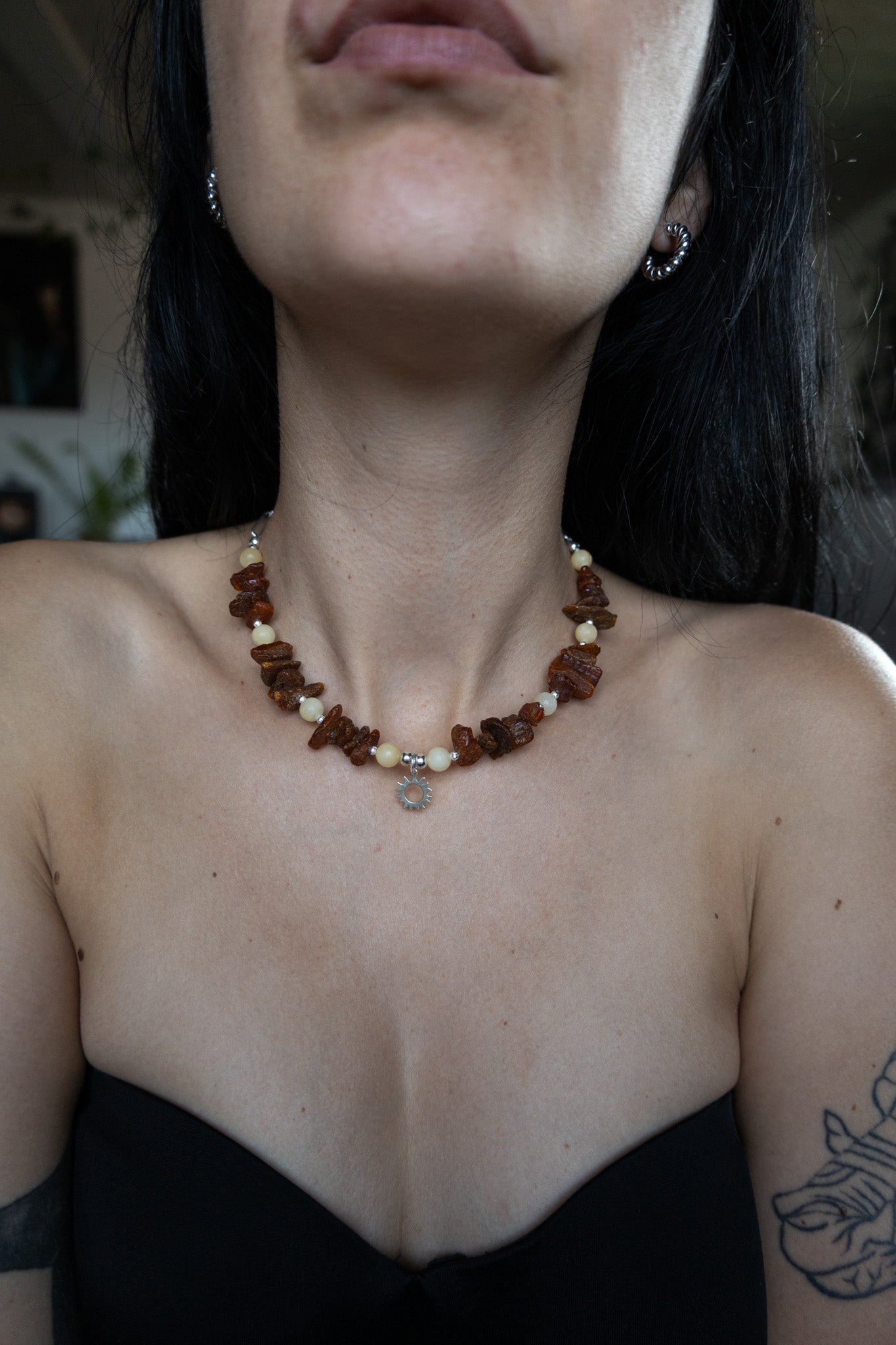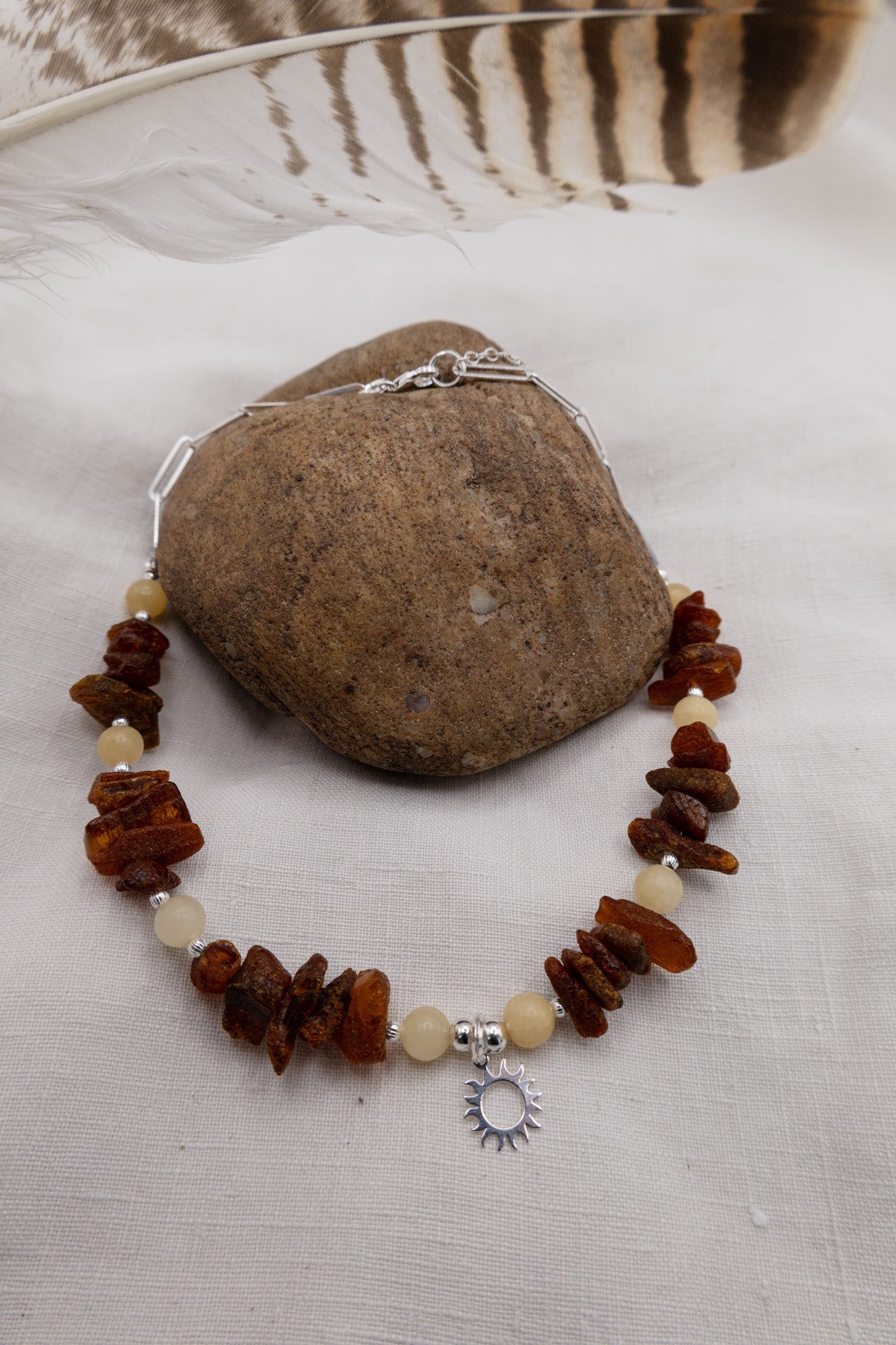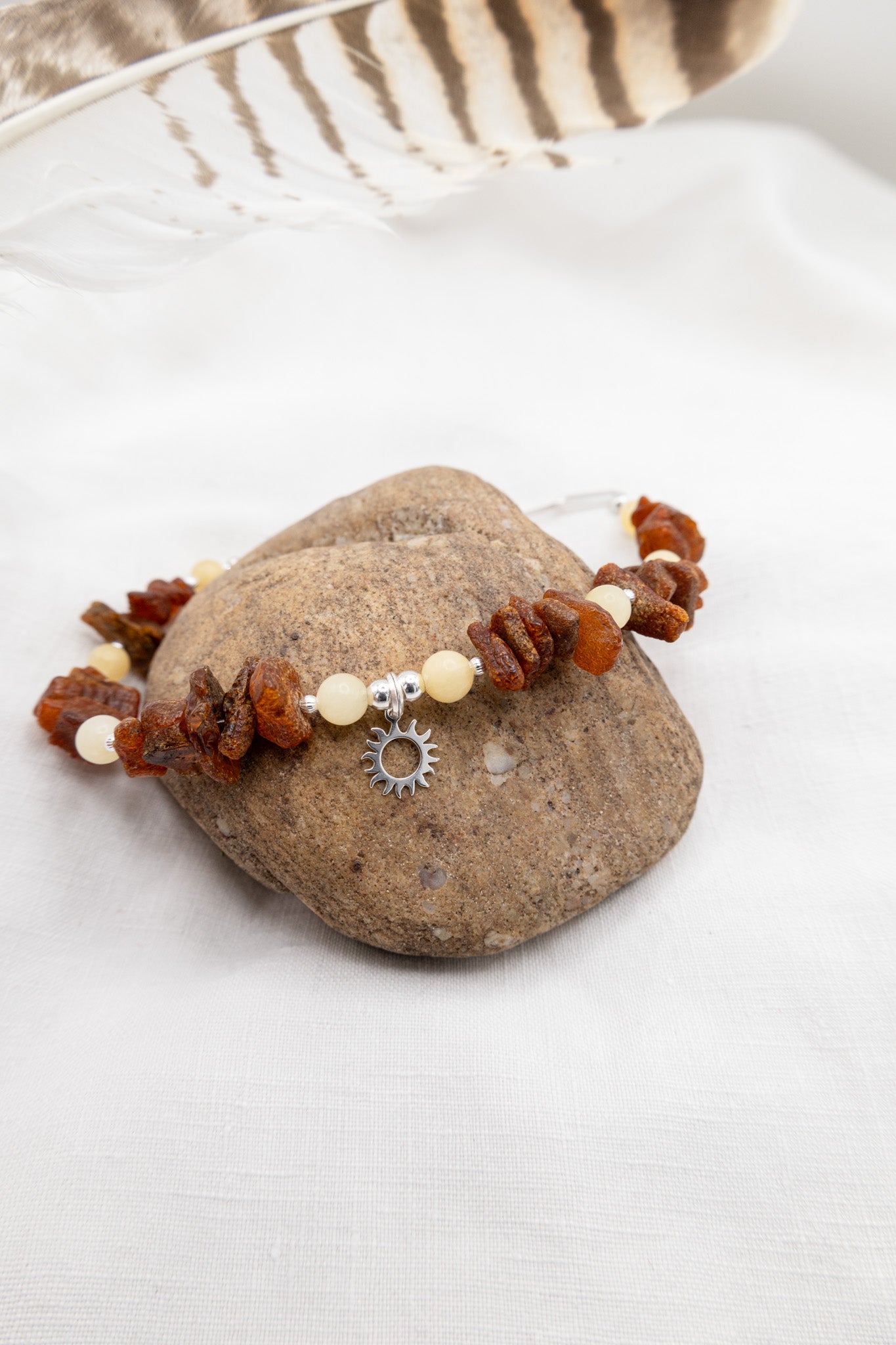 Der Bernstein trägt die Wärme längst vergangener Zeiten in sich. Er wirkt beruhigend, fördert ein inneres Gleichgewicht und bringt Leichtigkeit in den Alltag. Oft wird er auch mit Lebensfreude und einem klaren, offenen Blick auf das Leben in Verbindung gebracht. Der Orangencalcit ergänzt diese Energie mit seiner sanften, sonnigen Ausstrahlung. Er kann die Stimmung aufhellen, das Selbstvertrauen stärken und hilft dabei, neue Motivation und innere Zuversicht zu finden.