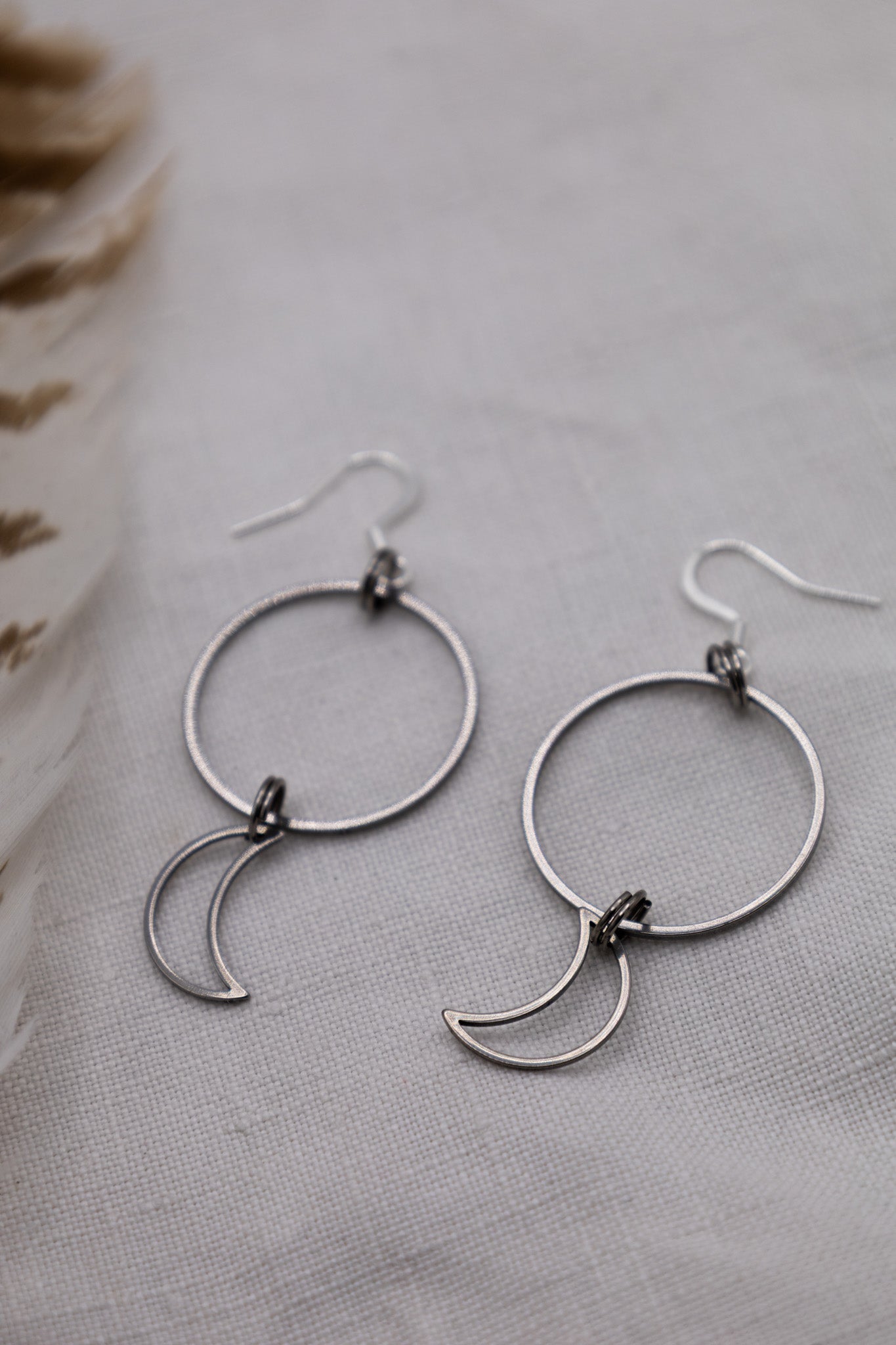 Diese Ohrringe aus Edelstahl zeigen filigrane Mondanhänger und verbinden modernes Design mit einem natürlichen Symbol.