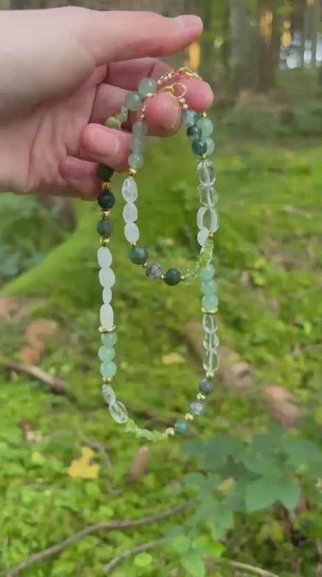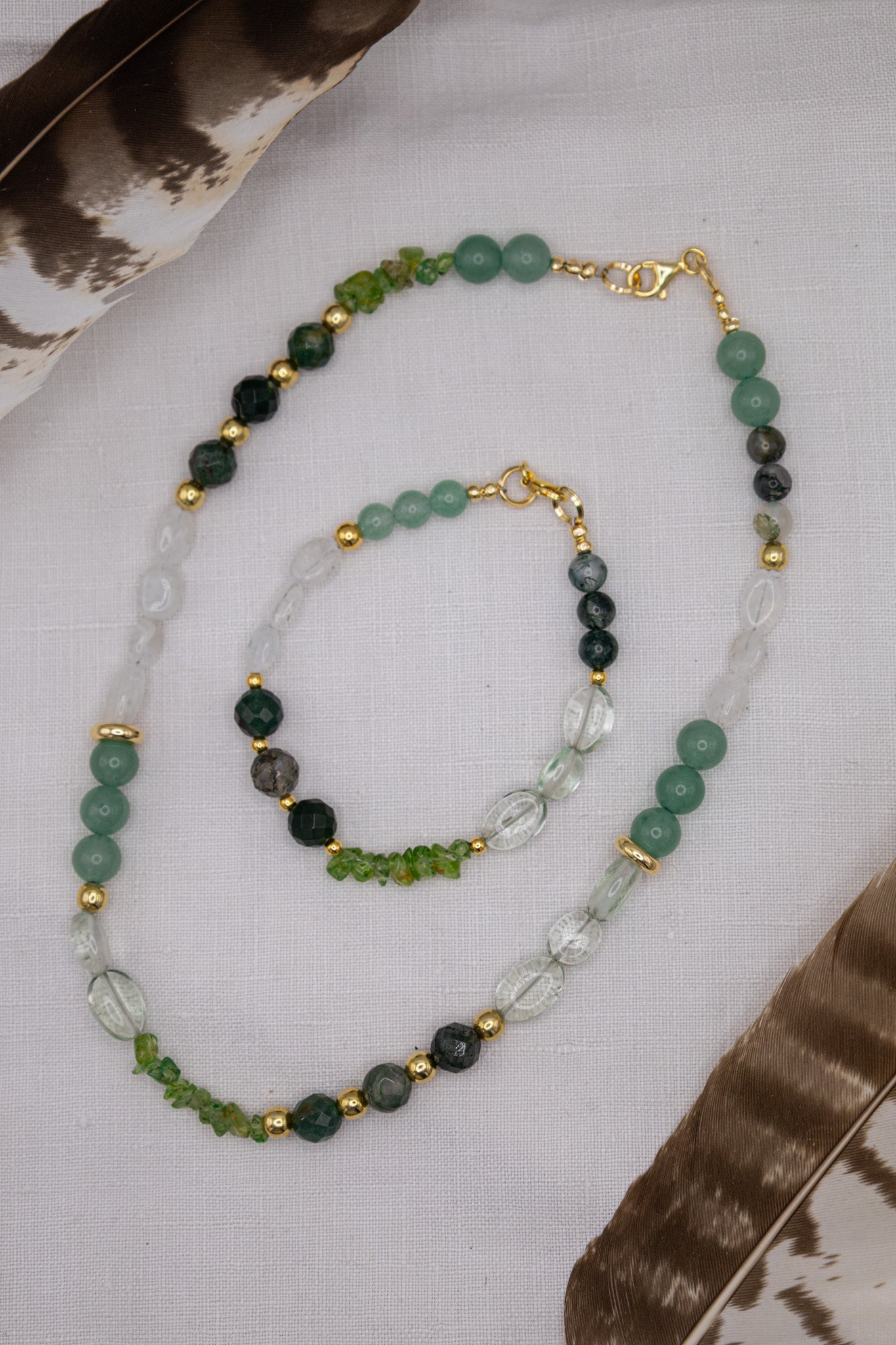 Gefertigt aus vergoldetem Sterlingsilber und liebevoll kombiniert mit Weißem Labradorit, Aventurin, Moosachat, Weißem Amethyst und Peridot, entsteht ein Schmuckstück, das Leichtigkeit und Balance ausstrahlt – wie eine Melodie aus dem Herzen des Waldes.