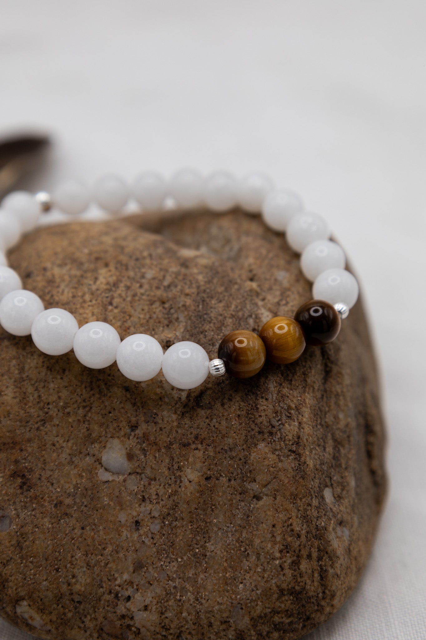 Weiße Jade steht für Frieden, Ausgeglichenheit und Harmonie. In Kombination mit dem Tigerauge, das Mut, Selbstvertrauen und Klarheit stärkt, entsteht eine kraftvolle Symbiose. Dieses Armkettchen erinnert dich daran, gelassen zu bleiben und gleichzeitig mit Zuversicht deine Ziele zu verfolgen – ein sanfter Wegweiser für Herz und Verstand.