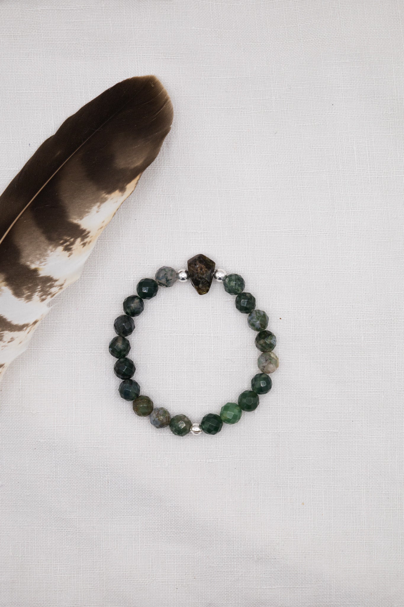 Der Grossular schenkt Hoffnung, Mut und stärkt das Selbstvertrauen. Er wirkt erhellend auf die Seele, hilft Geduld zu bewahren und öffnet den Blick für neue Perspektiven. Der Moosachat hingegen verbindet dich tief mit der Natur, erdet dich und steht für Wachstum und innere Balance.