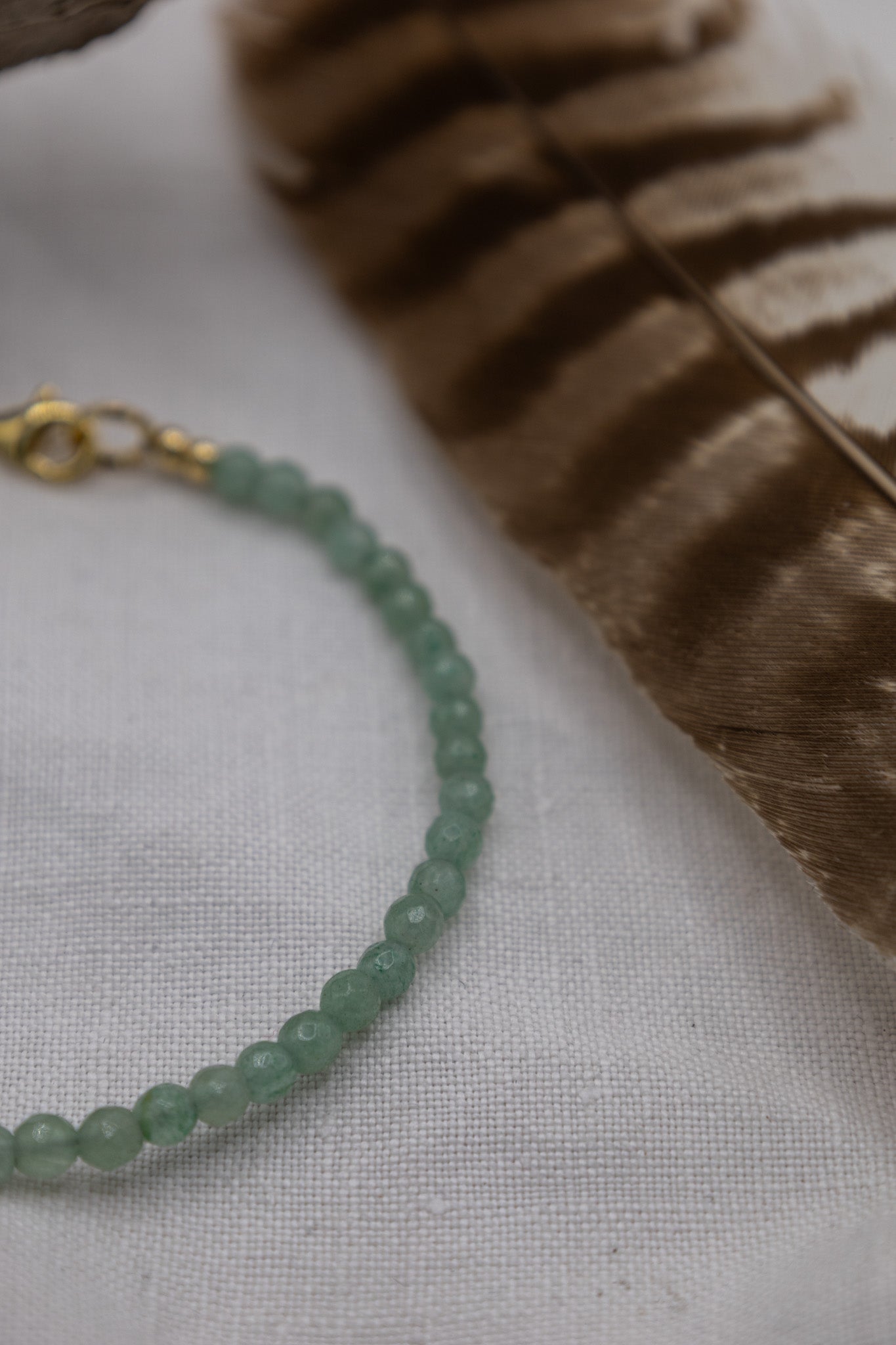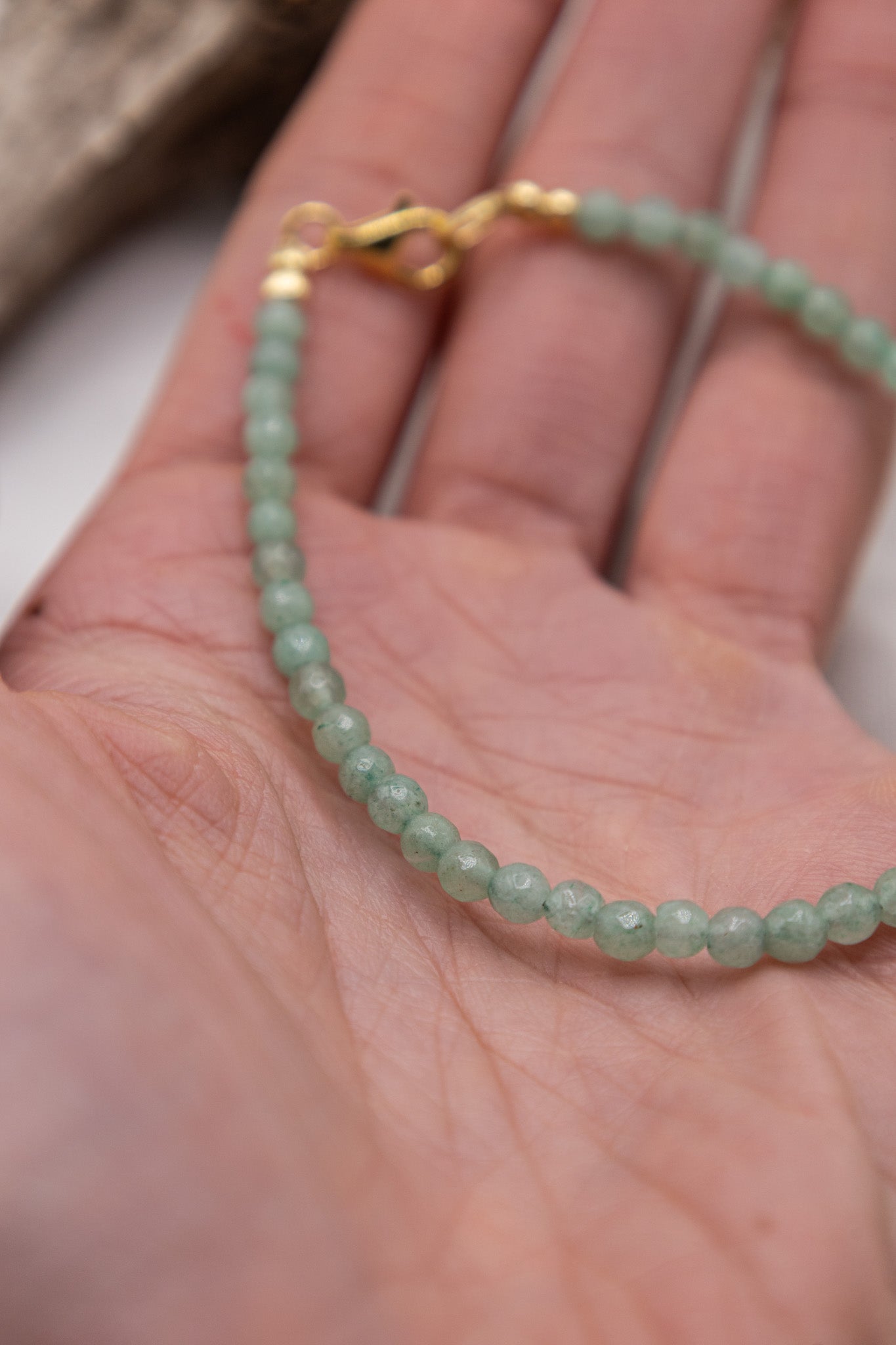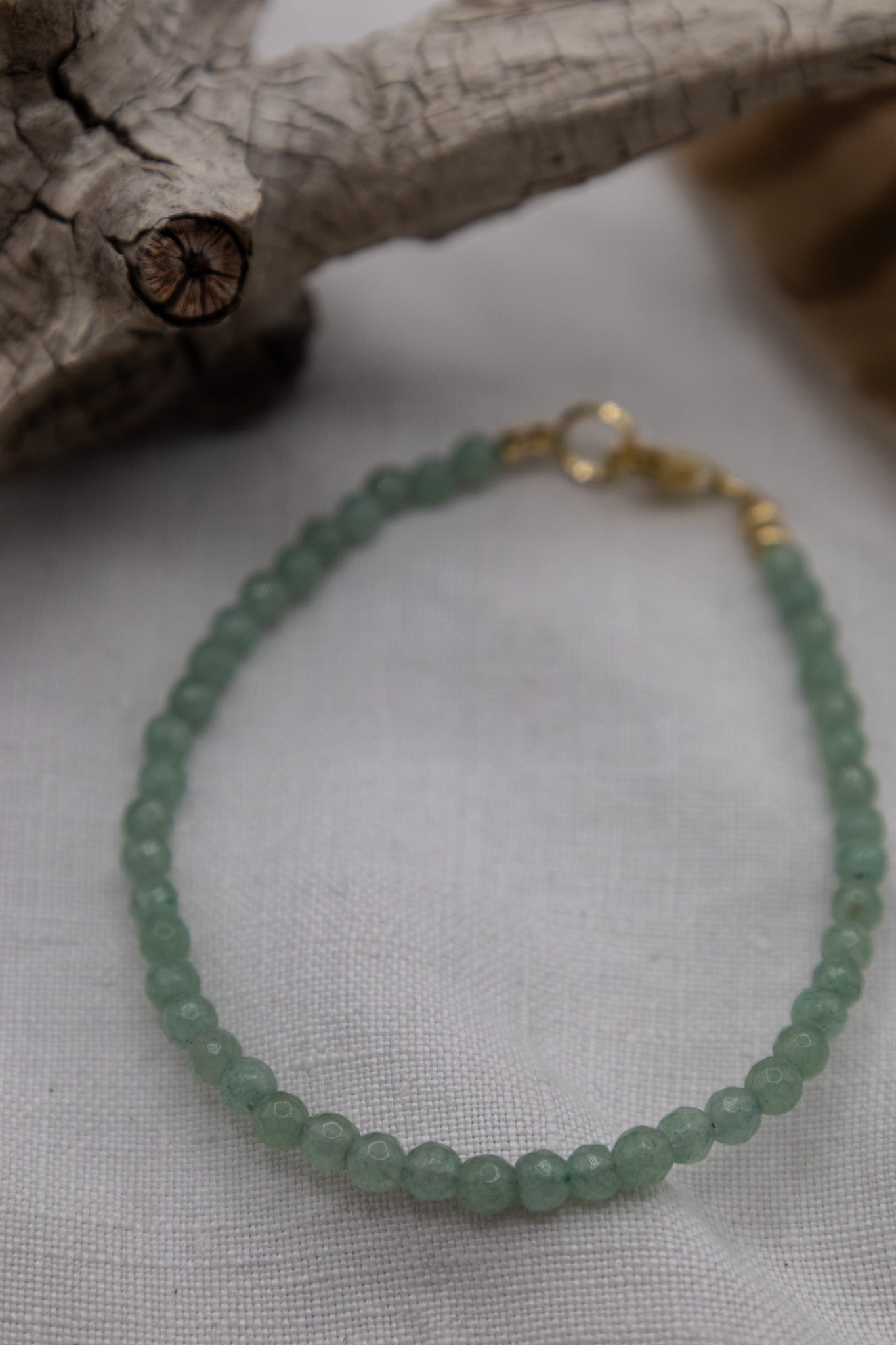 Die sanften Grüntöne erinnern an Wälder, neue Anfänge und die beruhigende Kraft der Natur. Dem grünen Aventurin wird traditionell nachgesagt, dass er Zuversicht, innere Ruhe und Lebensfreude fördern kann. Er gilt als Stein des Optimismus und soll dabei unterstützen, neue Wege mit einem offenen Herzen zu gehen und Vertrauen in den eigenen Flow zu finden. Seine Verbindung zur Natur macht ihn zu einem stillen Begleiter für Balance und Ausgeglichenheit.